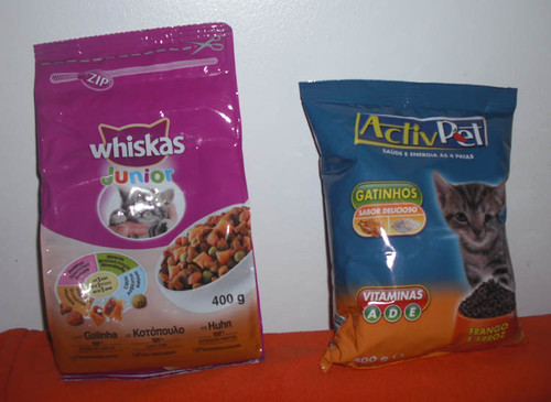 Até o Riscas ter um ano, vou lhe dar ração para gatinhos (Júnior), ele come bem quer da ActivPet (marca branca) ou da marca branca do Mini Preço, quer de outras duas de primeira marca que ele já provou. Mas o que será que é mais importante? Ver no verso os ingredientes?