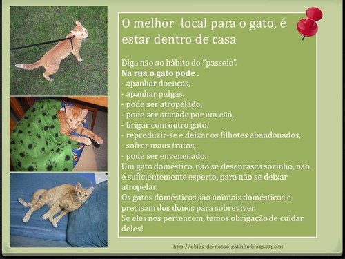 Aqui há uns tempos eu achava que o Riscas seria mais feliz se desse o seu passeiozinho à rua. Mas depois da primeira experiência e da minha pesquisa pela internet, acabei por entender que, afinal, o melhor para o Riscas é estar em casa. Uma ida à varanda já o faz feliz!