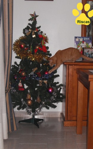 Uma árvore com muitas bolinhas para brincar, deve ser uma grande tentação para um gato! O Riscas que o diga...está sempre a ver se as tira para as pôr a rebolar no chão, enquanto corre atrás delas!