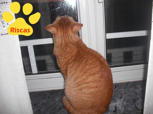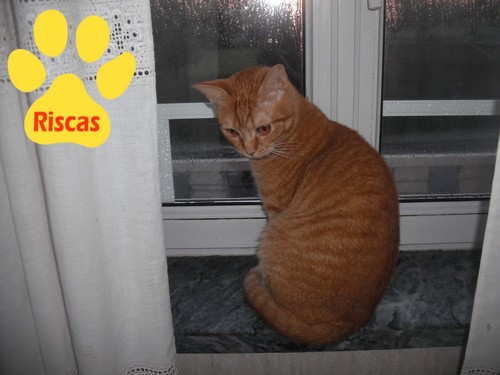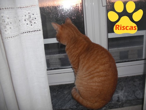O Riscas gosta de ficar à janela para apanhar sol e ficar quentinho. Mas desta vez ainda era de manhãzinha cedo, o dia estava "muito fechado", mas ele, deve ter pensado que o sol estava quase a chegar e ficou à espera.