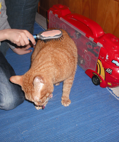 Hoje foi dia de banho para o Riscas. A parte da água ele não gostou e foram precisas duas pessoas, mas a parte de secar...ele não se opôs, e para finalizar...alguém o escovou:)