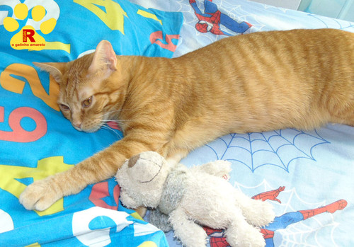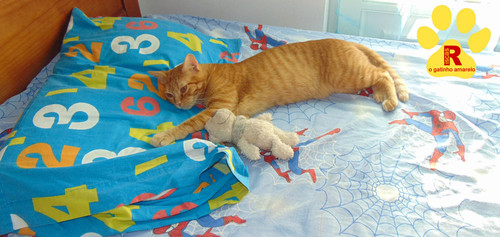 Reparem só no Riscas a tentar dormir à humano, cabeça na almofada, patinha esticada. Uma fofura!