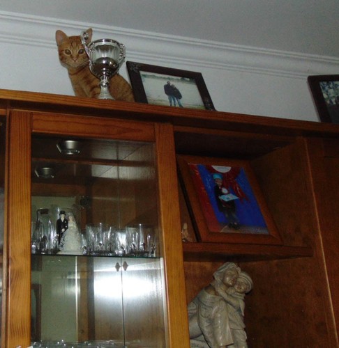 Certa noite, já bem tarde, eu estava na sala sozinha com o Riscas a ver a ultima novela. Saí da sala por um momento, mas deixei a porta fechada para o Riscas não ir para os quartos, incomodar quem já dormia. Quando regresso à sala, o Riscas não estava lá. Procurei-o por todo o lado. Fui buscar a caixa da ração e chocalhei-a, normalmente sempre que faço isto, o Riscas vem ter comigo a correr. Depois abri a porta da varanda, porque também é um truque, pois ele vem logo a correr para ir à varanda, mas nada! Chamei-o carregando no “i”, tipo Riiiiiiiiiiiiiiiiscas, o que normalmente, ele atende. Ainda o procurei nas outras divisões, não fosse ele ter saído da sala sem eu dar conta, mas nada! Comecei a ficar seriamente preocupada. Fui acordar o marido que já dormia há horas, expressando a minha preocupação com o “desaparecimento” do gato, mas ele só disse que o “bicho tinha de estar em casa”. Já sem saber o que fazer, volto para a sala, e olho para o tecto, e …lá estava ele, impávido e sereno, na estante a olhar para mim com desdém! Esteve lá o tempo todo, e esteve-se a borrifar para mim! Como é que não me lembrei de olhar para a estante antes? Os gatos são danados!
