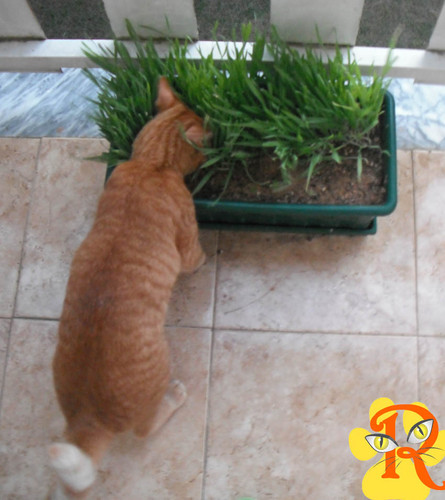 Levo o Riscas à minha varanda. Ele chega ao pé do vaso das ervinhas que semeei para ele, esfrega o focinho nelas, cheira-as e depois deixa-as. Ainda não deve ter percebido que as mesmas são para ele comer!