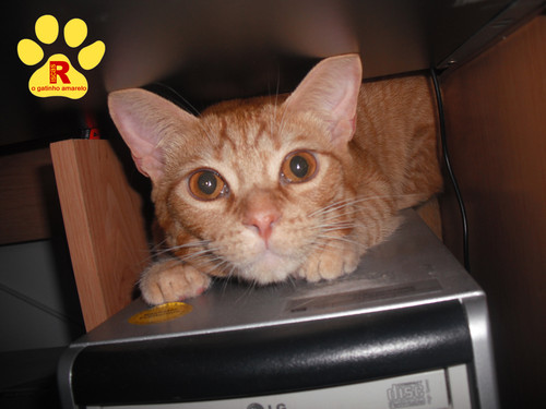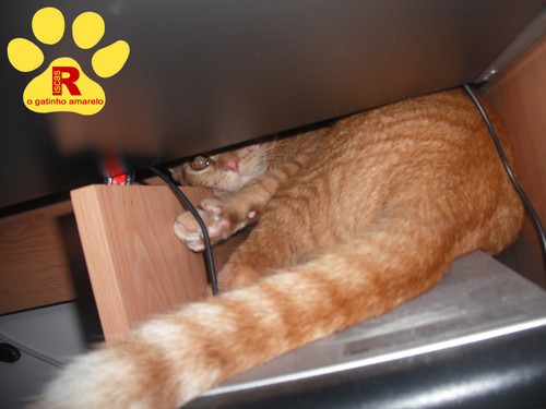 O Riscas estava num sitio bem apertado, ou seja, entre a torre do computador e a parte da mesa que se move, resolvi tirar uma foto. A foto não tem efeitos especiais, mas parece que o olho do Riscas saiu da orbita. Estranho não!?