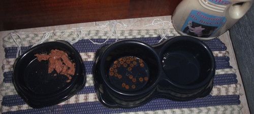 O Riscas, como gato mimado que é, tem três pratos: um para a água, outro para a comida seca (ração) e outro para a comida húmida! E quando tem os três recheados qual é que ele prefere? A ração!