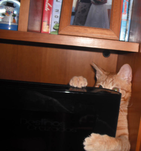 Uma noite destas ouvi um barulho na sala e pensei: " O Riscas atirou a TV ao chão!"; mas não, apenas tinha derrubado uma caixa de brinquedos! É que o Riscas anda sempre a pendurar-se na TV!